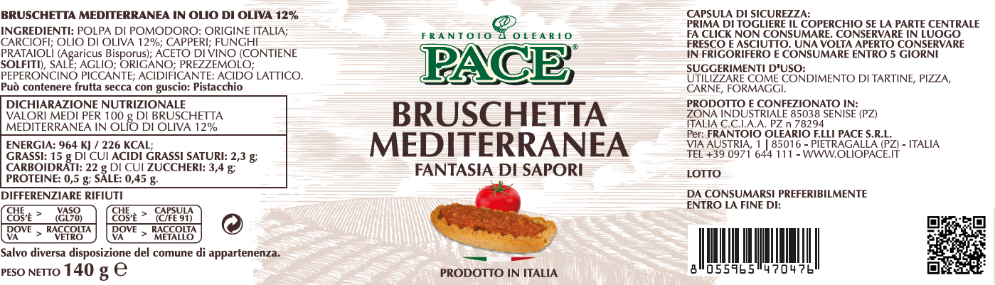 La bruschetta mediterranea in olio di oliva hanno un periodo di conservazione pari a 3 anni dalla data di confezionamento. Il lotto e la scadenza sono riportati in etichetta.