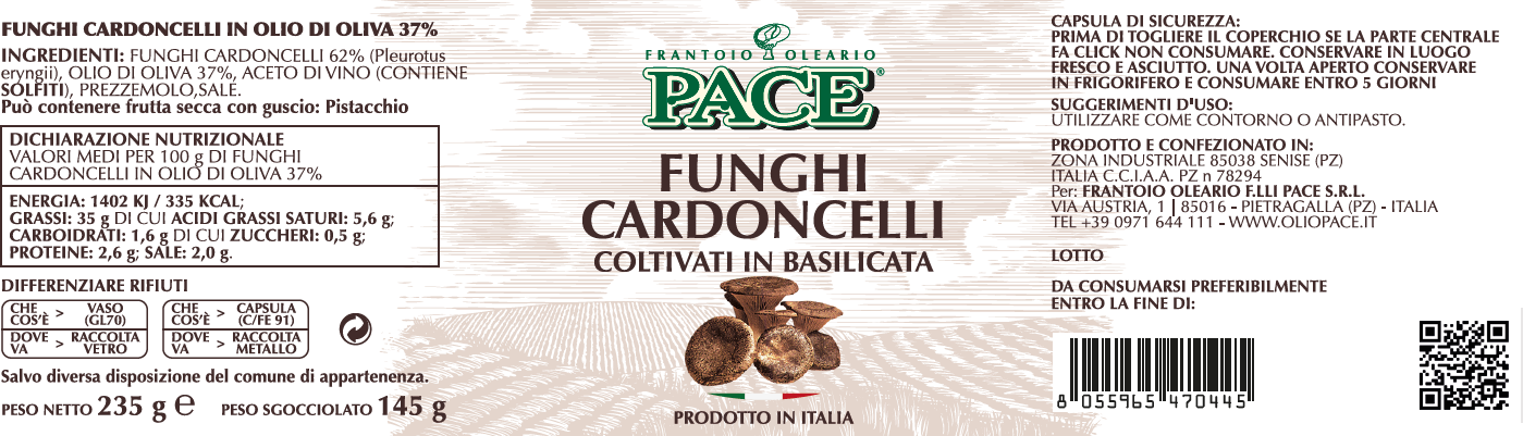 Funghi cardoncelli 60% (pleurotus eryngii), olio di oliva 39%, aceto di vino (contiene solfiti), prezzemolo, sale.